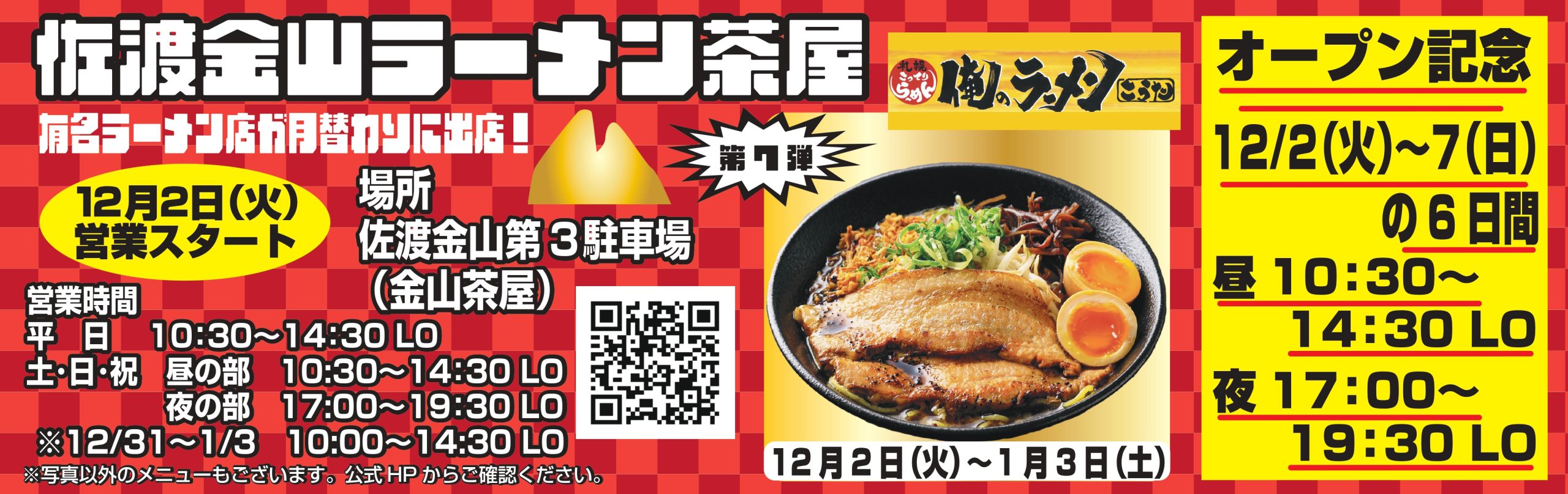 12/2(火)からは、佐渡金山ラーメン茶屋 第7弾「俺のラーメンこうた」がオープンいたします!! 多くのお客様のご来店をお待ちしております。