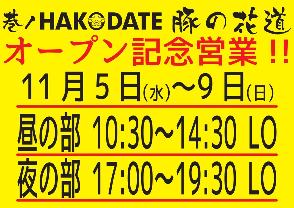 11/4(火)は、店舗入替の為、臨時休業いたします。 2025年10月31日 最終更新日時 : 2025年11月7日 wpmaster 11/5(水)からは、佐渡金山ラーメン茶屋 第6弾「巷ノHAKODATE豚の花道」がオープンいたします!! 多くのお客様のご来店をお待ちしております。