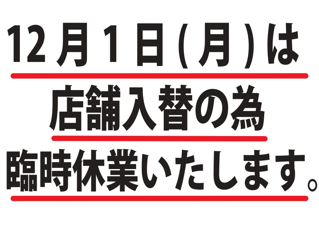 12/1(月)は、店舗入替の為、臨時休業いたします。